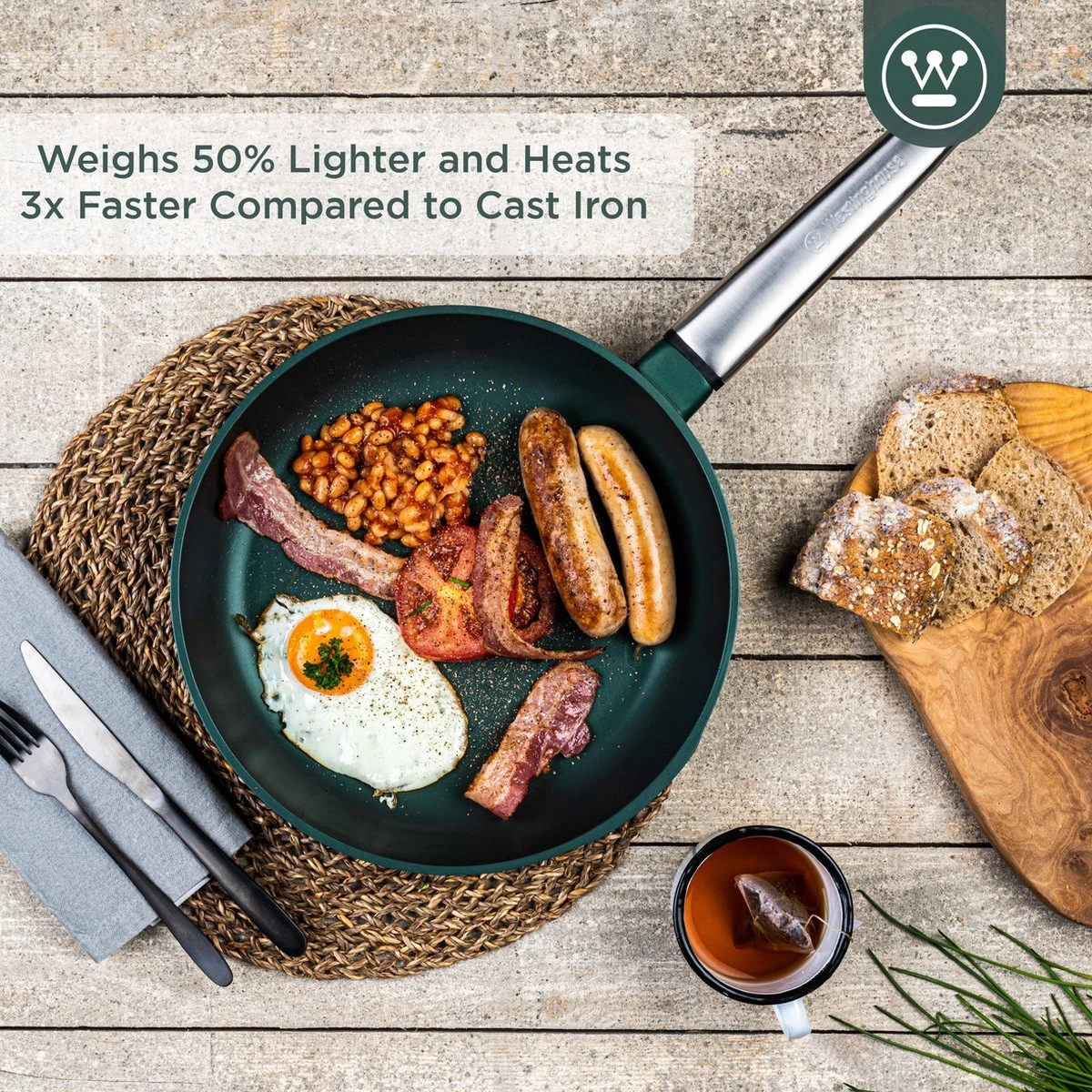 De Westinghouse Performance pannen zijn gemaakt van gegoten aluminium, waardoor ze veel lichter zijn dan de pannen van gietijzer. Hierdoor worden deze pannen drie keer zo snel warm als gietijzeren pannen en zijn ze veel makkelijker te verplaatsen van kast naar fornuis. Daarnaast zijn de pannen geschikt voor alle fornuizen en ovens!